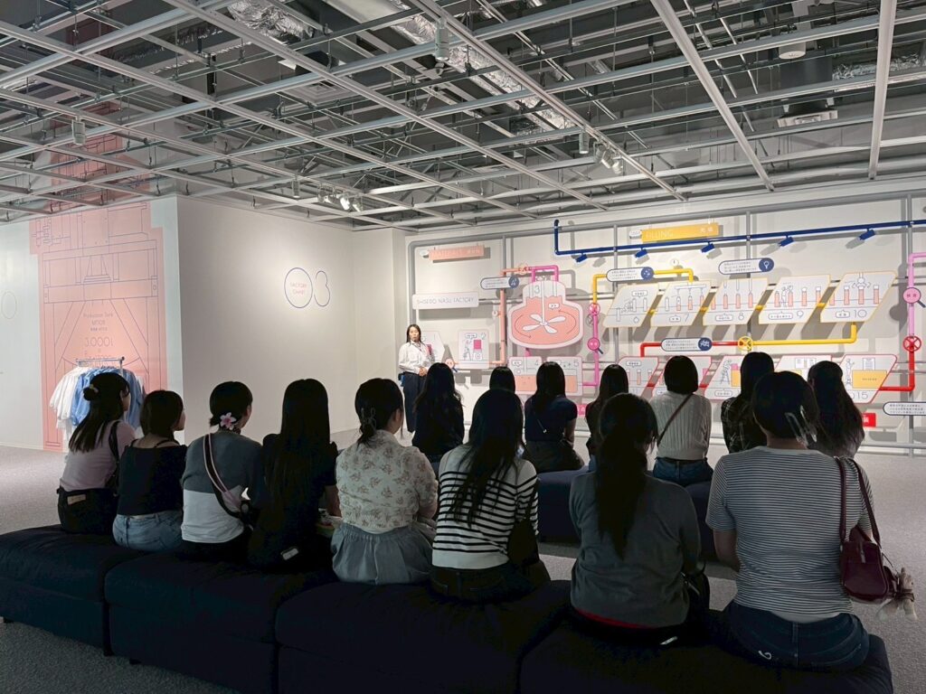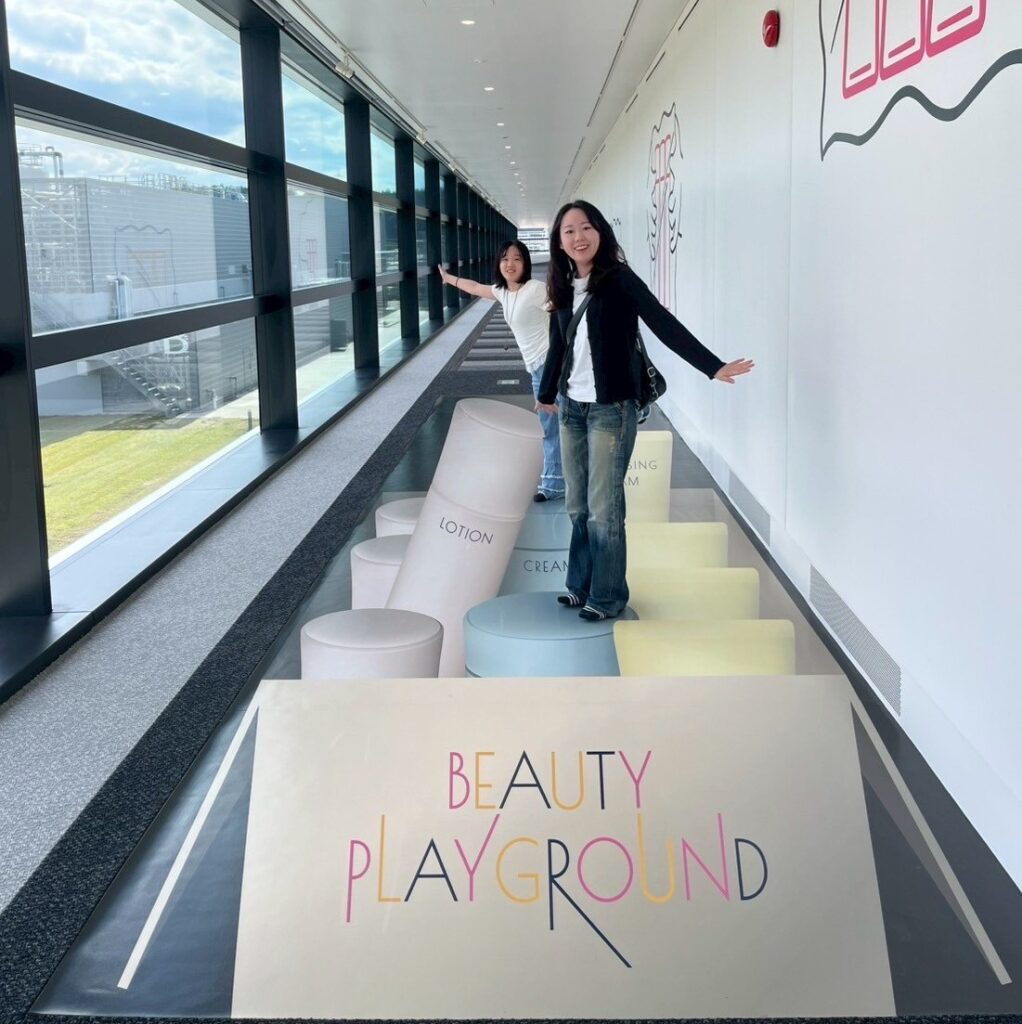 前半は、化粧品がどのように作られた後、梱包されて私たちの手元に届くのかについて学びました。実際に化粧水が作られている巨大な窯や製造ラインを見学したりしました。製造ラインの床は、従業員の方のモチベーションがあがるようにと色が工夫されていたりするなど、那須工場で働く方たちの環境も知ることができました。また、今までの資生堂における化粧品づくりの歴史やいろんなメイクアップを楽しめる映像体験など、普段何気なく使っている化粧品について、意外な知識など詳しく知ることができました!