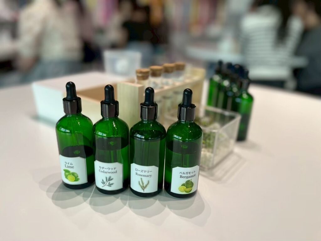 後半は、「那須の香り」として配合されている香りの中から、自分で好きな香りを選んでアロマオイルを配合するというワークショップを体験しました。みんな一滴も無駄にしないように、慎重に容器へ移すなど真剣にアロマづくりをしていました!私は、卒論執筆の疲れを癒せるようにとリラックス効果があるアロマを中心にオイルを作りました!各々が配合したアロマオイルは、石に垂らして香りを楽しむアロマストーンにできるようにと、石のプレゼントもありました!