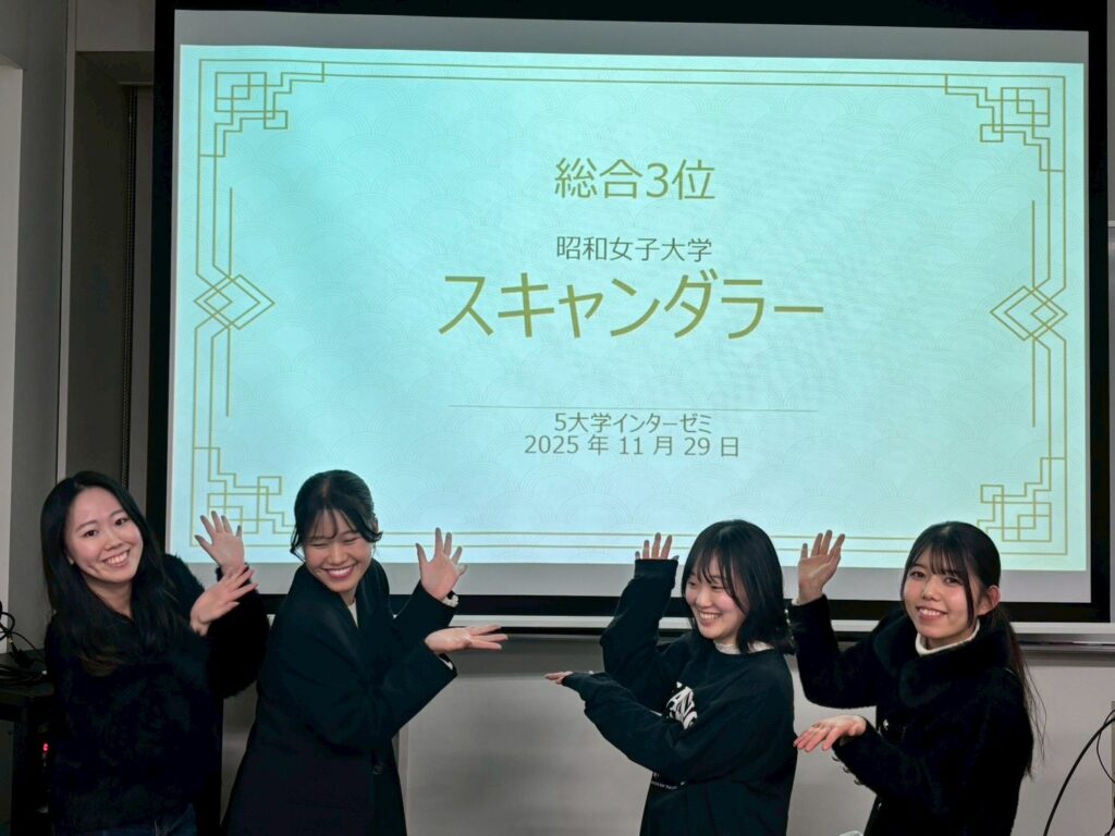 今回、昭和女子大学から参加したチームのうち、スキャンダラーチームが総合3位を受賞し、さらに昭和の貢gistチームが研究賞を受賞するという素晴らしい成果を収めました!!!日々の努力が評価され、ゼミ全体としても非常に誇らしい結果となりました。
