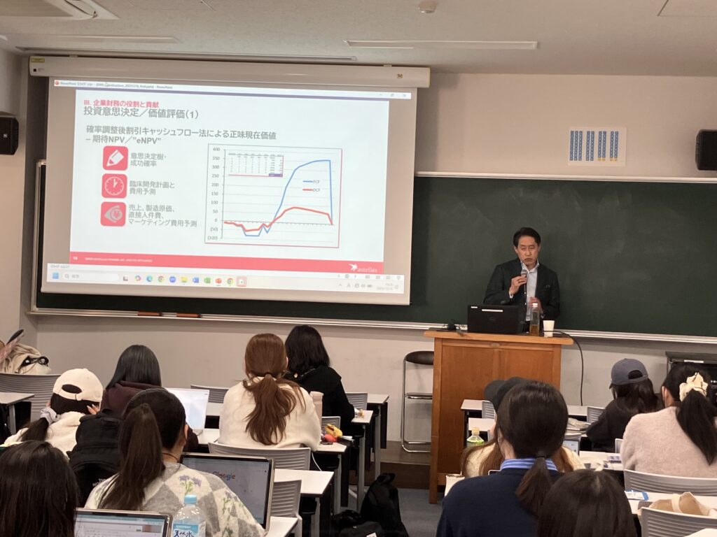 今回のゲスト講義では、医薬品ビジネスの本質は利益を追求することと同時に、患者様にとっての「価値」をいかに創出するのかにあることを学びました。長期的かつ不確実性の高い医薬品の研究開発を支えるためのファイナンス知識の重要性についてお話しいただきました。